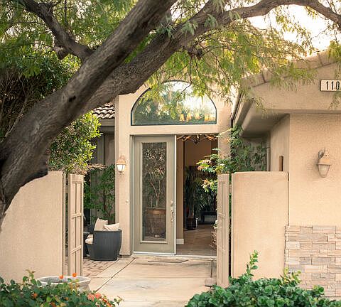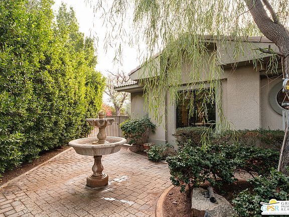 Welcome to your private escape within this contemporary Mediterranean oasis. One of just ten homes in a gated community, this professionally designed residence offers three bedrooms plus a den/office, three bathrooms, and sits on an expansive lot of over 16,000 square feet at the end of the cul-de-sac.From the moment you arrive, you are welcomed through a gated front courtyard adorned with lush landscaping and a tranquil bubbling fountain. Inside, the foyer showcases soaring ceilings and generous wall spaceideal for displaying art and treasured collections. The open living areas are both gracious and well defined, featuring a breakfast nook with bay windows, a formal dining area, and a comfortable living room anchored by a fireplace.The open kitchen is perfectly suited for both everyday living and entertaining, offering guest seating and a spacious pantry. French doors off the south-facing living area open wide to invite natural light and breezes, leading to a private lanai and BBQ, surrounded by verdant backyard complete with a custom salt water pebble tech pool and slate rock waterfall spa.The oversized lot provides ample room for a future ADU and includes a generous garden area with mature fruit treesincluding Lemon, Mexican Lime, Pomegranate, and Fig. Ideal for those with a green thumb. Back inside, the master bedroom is a true retreat, featuring French doors that open to a seating area and a spa-inspired bath, large walk-in closet, and a fireplace. With direct access to the backyard, the suite offers seamless enjoyment of the outdoor spa on relaxing evenings.Just across the hall one will find a flexible room (listed on records as the fourth bedroom) that opens to the front courtyard and serves beautifully as an office, media room, or creative space.Continuing down the hall, you'll find a convenient powder room with nearby linen storage, along with two additional bedrooms that share a full bathroom. Additional amenities include a three-car garage, a spacious laundry room with extra storage, paid-for solar panels (installed but not connected), and a dual-zone HVAC system.This sophisticated home offers remarkable versatility ideal as a full-time residence, weekend retreat, work-from-home haven, or peaceful escape from the bustle just beyond. Conveniently located near Mission Hills Country Club and a short drive to shopping and dining, this quiet, well-maintained community offers a truly special desert lifestyle.