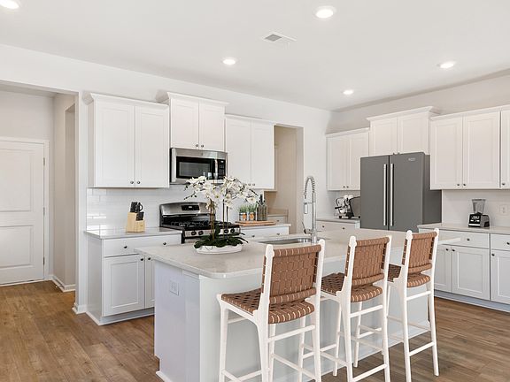 The impressive Jasper floor plan comes with four bedrooms with a guest suite downstairs, flex room, bonus room, and a screened porch backing up to a pond. You enter the home in a spacious entry foyer and make your way to the formal dining room followed by a two-story family room. There is a casual flex room and dining area open to a very nicely appointed kitchen with white cabinets, white subway tile backsplash, white quartz counter tops, stainless steel gas appliances, a counter-height island, and a large butler's pantry. Upstairs you will find your spacious owner's suite with two walk-in closets, and spa bath with dual vanities and separate garden tub and shower. There are 2 other bedrooms, a full bath, and a large bonus room on the second floor. Additional features in this homeinclude laminate floors throughout the common areas downstairs, tile floors in all full baths and laundry room, raised vanities, staggered kitchen cabinets with crown molding, architectural shingles, and fully landscaped yard.