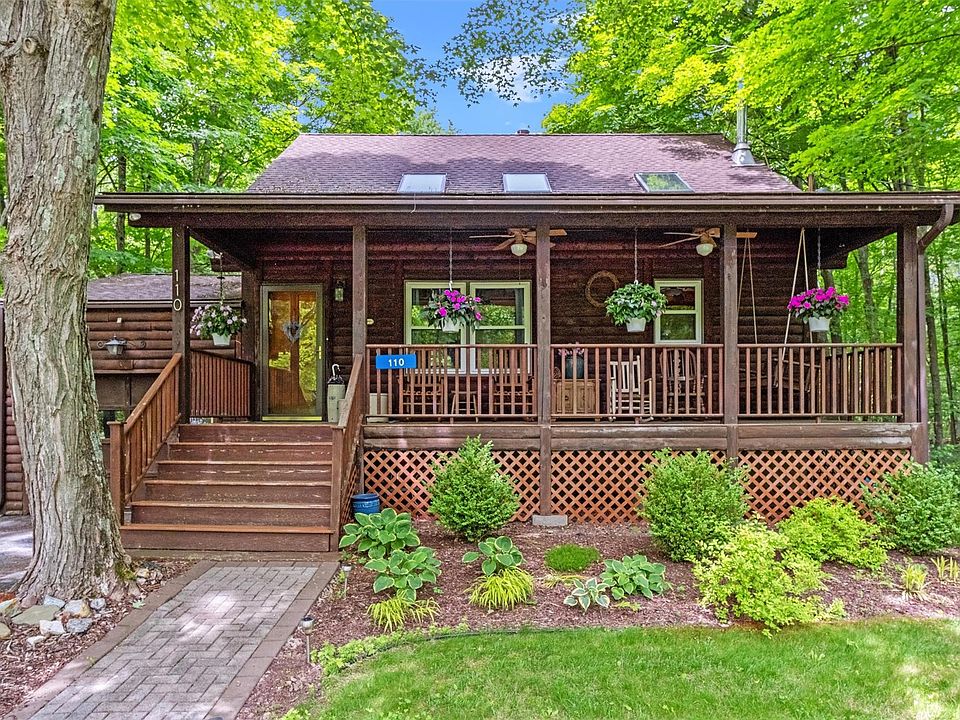 Welcome to this magnificent log home featuring a beautiful covered front porch. As you enter the home you will be amazed by the beauty and charm throughout. Wonderful open floor plan with soaring beamed ceilings, skylights and gorgeous woodwork. The kitchen has been tastefully done with a nice breakfast bar open to the dining room. Just off the dining room is a lovely screened in porch that overlooks the private fenced in backyard. There is a first floor bedroom with access to a dual entry updated full bath. Upstairs you will find the primary bedroom that glows with warmth and comfort. You will love the built-in draws and pull out for shoes. Another dual entry full bath can be accessed from the primary bedroom and the 3rd bedroom. The finished walk-out lower level has a good size family room, a smaller room, access to the enclosed area where you can enjoy the hot tub and a utility room with the washer and dryer. Located minutes to shopping, schools and the Taconic. Shows beautifully and is definitely worth seeing.