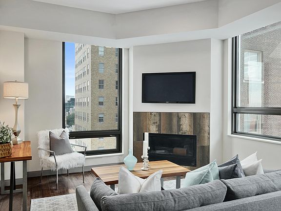 Corner unit with double sink and fireplace! **The Harper has spectacular apartments with stunning city views and exceptional features including gourmet kitchens, high ceilings, and hardwood floors throughout. And with a 13,000 sf amenity package The Harper takes luxury living to the next level (underground parking, state of the art fitness center, indoor basketball court, outdoor pool and sun deck plus 10,000 sf green park with patio furniture, hammocks and grills, dog park, clubroom, co-working space and more). Parking is available at $395 per month. The rent includes water, sewer, trash and all amenities (we are waiving the amenity fee for the length of stay for everyone this season). Tenant pays for electricity, cable and internet. 12 month lease