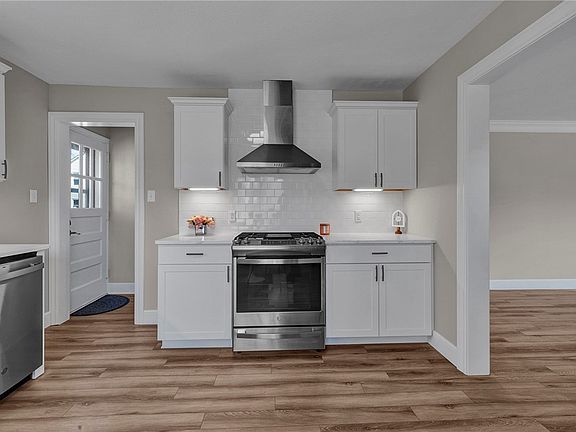 This darling brick home has been completely renovated. The EIK has been redesigned w/new cabinetry, stainless appliances & stove hood, white quartz countertops w/subtle gray veining, subway tiled backsplash & w/under cab lighting. The LR features crown, a stone fireplace w/shiplap accents, a large picture window & LVP flooring that ties the main level together seamlessly. Two main level BRs & a brand new bath featuring a custom tiled tub/shower. The primary BR suite located upstairs boasts extreme privacy. Features include a vaulted ceiling w/an office nook & a lovely bathroom w/built in storage & custom tiled shower. New carpeting in all BRs & staircase. The enclosed sunporch features trendy exposed brick & a wood ceiling, a perfect spot to enjoy some quiet time gazing at the river. New composite deck of the kitchen, full basement, water softener/filter & spacious tandem garage. Also fresh paint & new glass block/garage door/fixtures/carriage style interior doors/front door/shutters.