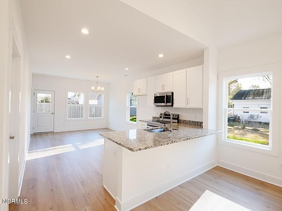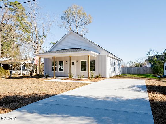 Welcome home to this bungalow style new construction home in the heart of downtown Burgaw. This modern style home is picturesque with its covered rocking chair front porch. Built to capture the full use of space throughout, this new home features an open layout with 3 bedrooms, 2 full bathrooms and a generous size laundry room. Inside features 9' ceilings, recessed can lights, craftsman style trim, 42'' shaker cabinets in kitchen and both bathrooms. Kitchen has stainless steel appliances and plenty of cabinets for added storage plus a large bar seating area with granite countertops. This home is great for entertaining with the kitchen open to the dining & living areas. LVP in the living areas, tile in all wet areas and carpet in the bedrooms. All bedrooms on one level with 2 guest bedrooms split by the shared full bathroom. Tile floors in this bath with quartz countertops. Laundry room with lvp floors. Primary Bedroom on the back of the home. Bathroom with tile floors, dual sinks with quartz countertops. Large walk in shower with tile walls! Full walk in closet for plenty of storage. Enjoy the charming town of Burgaw with restaurants and shops just blocks away. Just 30 minutes from Wilmington. This home is completed and move in ready! Seller offering a $10,000 use as you choose allowance.