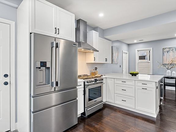This striking brand new gut renovation is bright and spacious with an open floor plan as well as central air, hardwood floors, and recessed lighting throughout. The modern kitchen has white quartz counters with an oversized peninsula, white cabinetry with extensive storage, stainless appliances, a vented out hood, wine and beverage fridge, matte black accents and washer and dryer in unit. Flowing from the large, luminous living space with room for a dining table, the primary bedroom is king sized with walk in closet and stylish ensuite bathroom with walk in shower and glass enclosure. The 2nd bedroom accommodates a king bed, is filled with light, and boasts a large built out closet while the 3rd bedroom fits a queen bed or functions well as an office. Outside the unit, the front deck is sunny and sizable and has an outdoor closet for extra storage. A private patio sits nestled into the hill and a huge private storage room sits in the basement.