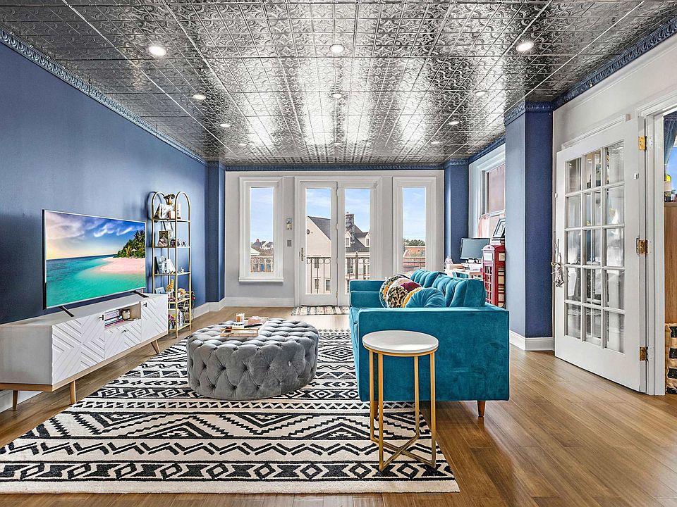 Meticulously updated over the years, the home is filled with personal style, color and creativity making it truly one of a kind. The open-concept Kitchen and Living Room are bathed in natural light and showcase awe-inspiring views of the NYC skyline. French Doors lead into the oversized Bedroom, while a private terrace provides the perfect setting to enjoy your morning coffee or evening relaxation with extraordinary views of the Hudson River and Manhattan's Financial District; also included is a full-size washer/dryer and a walk-in cedar closet.