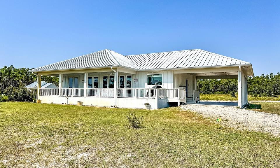 Welcome to this newer home in the sought-after Shell Bay Ct. Subdivision, a peaceful coastal community where natural beauty meets modern comfort. This thoughtfully designed residence offers 3 bedrooms and 2 full bathrooms, blending quality construction with stunning views and an inviting floor plan that's ideal for everyday living or a relaxing retreat. The spacious master suite is a true highlight, featuring a tiled walk-in shower with a sleek glass enclosure, a double vanity, and generous closet space. Two additional bedrooms provide room for family and guests, or the option to create a private home office or hobby room. At the heart of the home is a bright and open kitchen, complete with stainless steel appliances and a large walk-in pantry/laundry room that makes organization simple. Solar system installed in 2023 with a consumption offset of 73%. The adjoining living and dining spaces flow seamlessly to the outdoors, where a large covered front porch offers the perfect spot to sip coffee while watching the sunrise over the bay. Built for durability and low maintenance, the home features Hardie board siding, a long-lasting metal roof, and a solid slab foundation. These details ensure that the focus remains on enjoying the lifestyle this location provides. Situated on a generous 1.10-acre lot, the property takes full advantage of its setting with spectacular bay views of the cut between Dog Island and St. George Island. Located in the desirable X flood zone, the home is elevated with just a 3-step entry, making access easy and convenient. Outdoor enthusiasts will appreciate that water access is directly across the street, perfect for fishing, boating, or simply watching coastal birds in their natural habitat. For adventure on land, Tate's Hell State Forest is only minutes away, offering endless opportunities for hiking, kayaking, and wildlife exploration. Seller has a Bayfront lot with a seawall that could be purchased separately with an agreed-upon price.