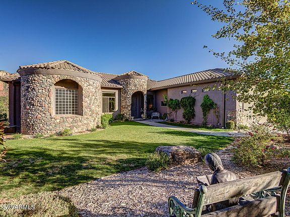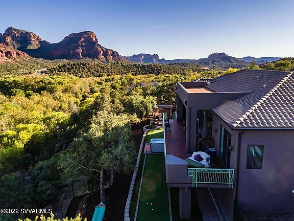 One of the most spectacular luxury homes in Sedona w/ breathtaking & panoramic red rock views! Beautiful single level estate w/ exquisite finishes & upscale appointments. An open & spacious design brought to fruition w/ meticulous attention to detail & completed in 2018(C of O attached). Soaring 12 ft ceilings & dramatic view windows. Incredible chef's kitchen w/ Miele, Sub zero & Wolfe appliances. Luxury & spacious primary suite w/ views, deck, massive custom closets & adjoining sumptuous bath w/ steam shower & jetted spa. Three en-suite bedrooms. Enjoy the sounds & views of Oak Creek from the 54 foot deck w/ outdoor fireplace. Available turn key & completely furnished. Spa & 3 car garage. Successful short term rental with Sedona.org. No HOA. OWC financing. SEE ADDITIONAL REMARKS. Special Features " Beautiful and inviting arched entry and rock exterior. " Appealing exterior features a three- car garage with 12 foot ceilings and ample storage. " Fully, professionally landscaped and irrigated; including rainwater recapture tank and organic garden. " Zen garden and Pergola graced by dual water features. " Backyard Spa and patio area enjoying stunning red rock views. " Putting green, bocce court and bean bag toss areas in addition. " Stargazing and sweeping views from the 54 foot deck enhanced by an outdoor fireplace, dining and barbecue areas. " Separate, lower level recreation room offering gaming area, shuffle board, lounging area and refrigerator. " Custom Travertine, cross cut, plank stone flooring. " Melting Point hand-blown and custom light fixtures. " Architectural design boasting soaring, twelve foot ceilings, art niches, skylights and recessed lighting. " Chef's custom kitchen features Miele ovens and warming drawer, Wolfe 6 burner range, Sub Zero built-in Cafe-style refrigerator and freezer with interior cold water purifier and dispenser. Matching cabinetry on Asko dishwasher and refrigerator. Great island with additional prep sink and seating. Generous walk-in pantry. " Faux painting, electronic Luminette window treatments, separate sitting area and coffered ceiling in expansive primary suite. " Massive, walk-in custom closets and extra storage with secret jewelry closet in primary suite. " Spacious primary suite bathroom includes separate vanities, hand hammered copper sinks, gorgeous granite, jetted spa tub, steam shower with bench, skylight, separate television and private commode room. " A total of three en-suite bedrooms of generous proportions. Adjoining bathrooms are appointed with custom cabinetry and finishes. " Professionally designed and installed custom, surround sound and outdoor speaker system. A total of six television monitors and systems are included. " Convenient laundry room includes extra large, top of the line washer and dryer, granite, ample cabinetry and storage plus hanging and folding areas. " Bonus storage shed plus under house, walk-in storage area.