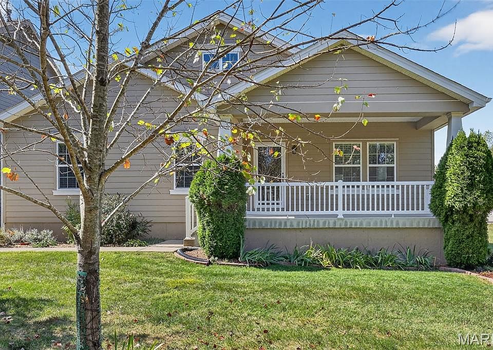Rare opportunity to own a newer ranch-style home in Wildwood under $400,000! Built less than 10 years ago, this one-level residence offers an open, light-filled floor plan and a peaceful setting overlooking wooded common ground and natural areas. The spacious design features an upgraded kitchen with 42” cabinets, crown molding, extended counters, and stainless steel appliances. Additional highlights include upgraded flooring, spindled staircase railing, gas fireplace, luxury master bath with adult-height vanities and separate tub and shower, stylish bronze hardware throughout, and a full basement with roughed-in plumbing—ready for your finishing touches.