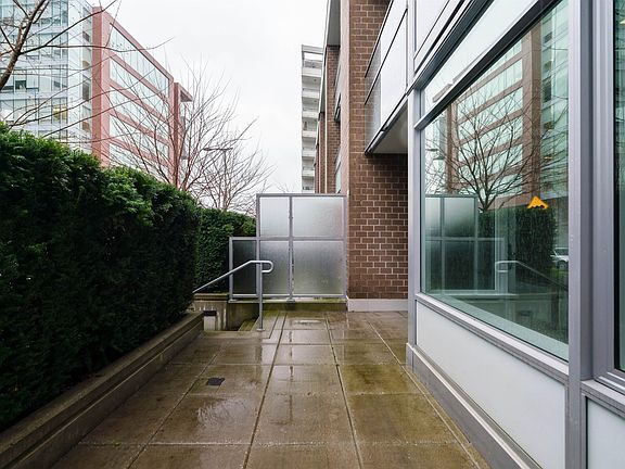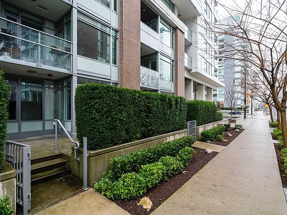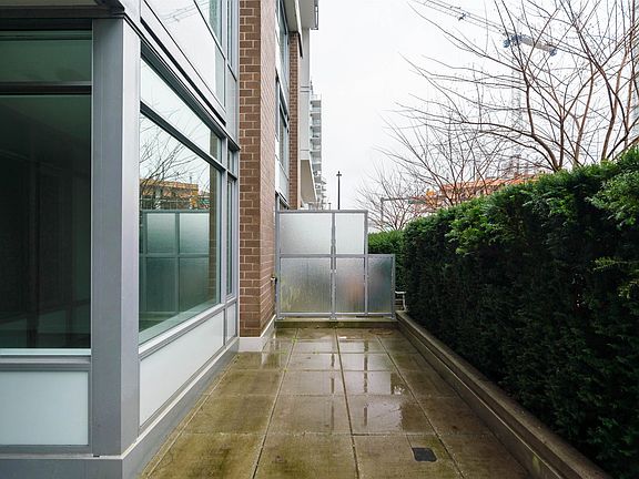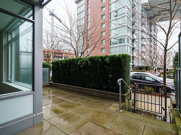 Open by appointment - Sat & Sun, April 16/17. 12-1pm. // Welcome home to Lido by Bosa, conveniently located steps to Vancouver's Olympic Village and Southeast False Creek Seawall! Built in 2014, this like new building offers modern amenities including concrete construction, AC, pool, gym and full-time concierge! 1 parking and 1 locker included. From here, you're steps to daily amenities including Skytrain, restaurants, shopping, breweries and more. Enjoy a nice stroll on the False Creek Seawall only steps from your front door. #107 is a spacious ground level 1 bedroom home with a massive 198sf private patio! This home lives like a townhome with your own front door to the street - great for pet owners. Quality finishings include Miela appliances, flat finish ceilings and stone counters!