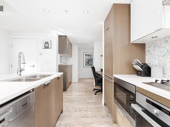 Stunning, bright, and airy CORNER 1 bedroom + flex at the luxurious Lido by Bosa. This SW facing 645 sqft home boasts tons of natural light! Your floorplan offers a large foyer with added built in storage & office space. Your gourmet kitchen features a S/S Miele appliance package including oven with gas cook top, dishwasher, integrated fridge, beautiful stone countertop & backsplash. Your spacious, open concept dining & living space showcase extra windows with beautiful greenery surrounding & upgraded electric fireplace. Other modern finishings throughout include LED smart lighting & Apple TV option in bathroom mirror! Lido's top amenities include exercise centre, outdoor pool, central A/C, and concierge. This home includes 1 parking stall, & 1 storage locker (on same level!).