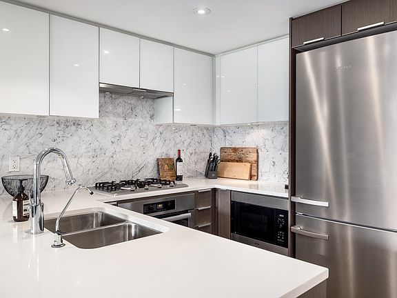BOSA's LIDO building has everything you've been looking for...including A/C! This corner 2 bed, 2 bath home is one of the best floor plans with no wasted space. This open airy plan includes over-height ceilings, laundry/pantry room, generous living & dining (or home office) well separated bedrooms, roller shades plus a covered NE facing balcony with views of the NS MNTS. The kitchen is sure to inspire with a Miele appliance package, quartz counters, marble backsplash & bar seating. Hotel style amenities include full time concierge, gorgeous lobby, fitness room, heated outdoor pool, sun deck, cabanas & lounge chairs. Walking distance to all the conveniences of the Olympic Village, local breweries, cafes, dog parks, bike paths, the seawall & water taxi. Parking & storage included.