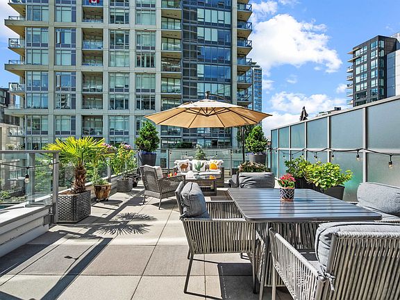 Welcome to the epitome of modern living in The Lido Building, by Bosa! This impeccably designed two bedroom condo is an entertainer's dream with an open concept layout that showcases a 577 SF sun drenched private terrace that opens up directly off your interior living space, making it the ultimate urban retreat. Gourmet kitchen, complete with granite counter tops, designer cabinets, laminate flooring, custom wall panelling throughout and central A/C. Lido boasts World Class amenities featuring as an outdoor swimming pool, gym, EV chargers at every parking stall, a pet wash station, and concierge. This unit also includes a large next-to-unit storage locker and one parking stall. Don't miss out on the chance to make this your own this hidden gem in the vibrant Olympic Village!