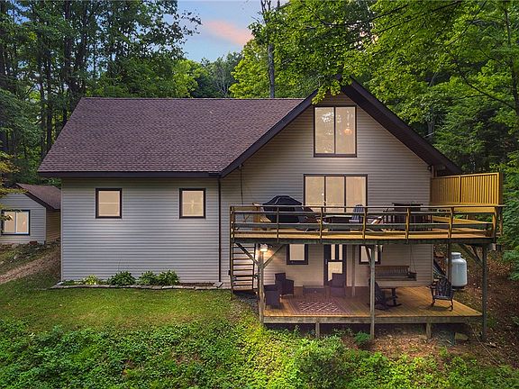 This lakefront home has character throughout, being sold completely furnished with lake inspired finishes highlighted by the warm oak, cedar and pine woods. Updated kitchen is open to the living area with brick fireplace and sliding doors open to the spacious deck with amazing lake views. One bedroom and bath conveniently located on the first floor; the loft area features a private bedroom & bath and relaxing sitting area overlooking the waterfront. The lower level includes an inviting family room, third bedroom and full bath. Relax on the covered porch area while enjoying the beautiful scenery. Wonderful 2 car garage with fantastic bonus room located above. Enjoy watching the big game in this spacious family/game room with added storage areas. Great new roof installed in August. Ride the included golf cart to the waterfront where you can enjoy the 100 feet of lake frontage, spacious deck area & awesome views all on beautiful & private Indian Lake.