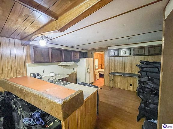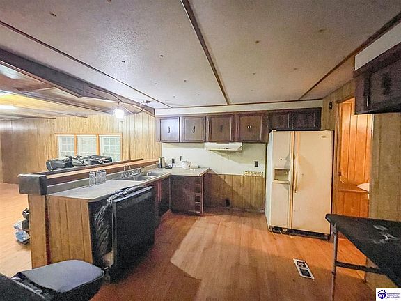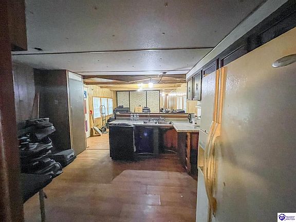 Come tour this 3 bedroom, 1 and a half bath home in Rineyville. With a little love, this home can be made in to a nice personal home or investment property. The kitchen is open to the living room and dining area. It has a bar area for extra seating and entertaining. The split plan has the primary suite on one side of the home, complete with its own bathroom. The second bedroom is nicely sized. The third bedroom is at the end of the hall and is large. The full bathroom is located between the two guest bedrooms, and the laundry closet is located in the hall between them as well. The property sits up high with a nice view of the neighborhood lake. The home is a single wide and is not on a permanent foundation, so no FHA, VA, or Gov. loans will qualify. The property is being sold in as-is condition. Come take your tour today!