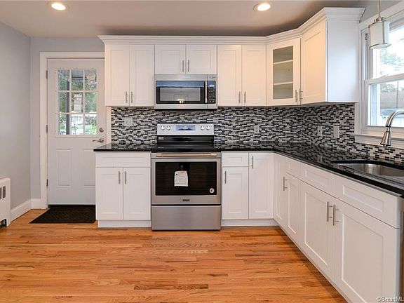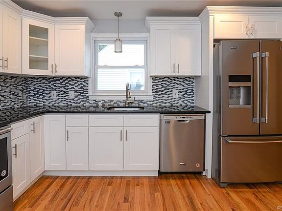 Fabulous Completely Remodeled Cape Style with Rear Dormer. This Updated Charmer has a Large L-Shaped Kitchen with Custom Bright White Cabinetry, Lovely Dark Speckled Granite, and Maytag Stainless Steel Appliances with 10yr warranty from manufacturer which flows into an equally comfortable dining area. Living Room with Bay Window, Large Bedroom, and Full Remolded Bath with Mosaic accent tiles and grey wide plank floor finish the main floor. Upstairs has two Large Bedrooms on either end with Large built in closets and small door to storage access. Full Remodeled Bath between the two Bedrooms Bright White Tiles and Black accent floor. Bedroom to the right with a walk out deck, stairs leading to backyard/Garage.