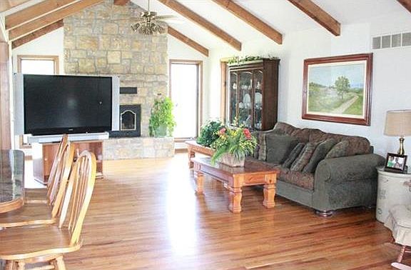 Beautiful Clean All Electric Country 3 bedroom,3 bath home on paved road. Open floor plan, raised beamed ceilings, stone fireplace with insert, hardwood floors, french doors to rear deck from living room. Kitchen has black appliances which all stay with the home. Master bedroom has large bay window with walk in closet. Basement has brick fireplace with wood insert, finished full bath, french doors walk out to patio. 4 garage stalls, 2 up and 2 down. Barn with 4 to 5 horse stalls. Fenced property with pond.