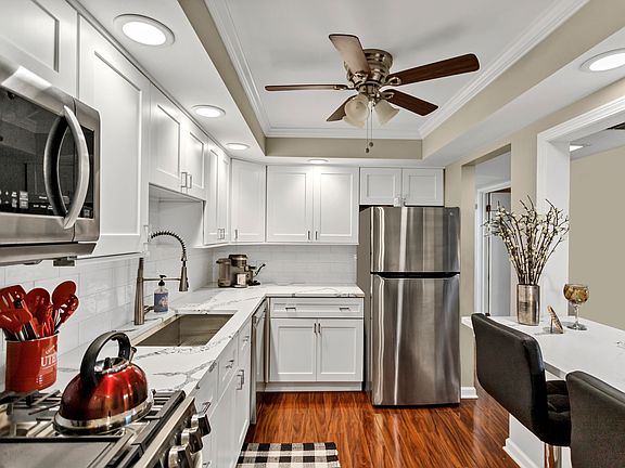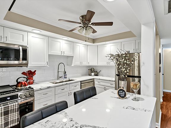 Welcome to your future home! A meticulously updated, freshly painted, contemporary 2 bedroom, 2 full bathroom condo that effortlessly combines luxury living with convenience! This remarkable residence, located in a coveted neighborhood, offers a truly exceptional living experience. The heart of this home is an impressive, FULLY UPDATED kitchen featuring exquisite quartz countertops that gleam with sophistication. Brand new, top of the line stainless steel appliances elevate your culinary endeavors to a whole new level! This kitchen is a true masterpiece, designed for both the gourmet chef and the everyday home cook. Enjoy the tranquility of your surroundings with peace of mind. The seller thoughtfully replaced all the windows in 2023, ensuring optimal energy efficiency and soundproofing. Both bathrooms in this condo have been thoughtfully updated, offering a spa-like experience in your own home. You'll walk on cloud nine with the new, stunning floors that grace every inch of this condo! Enjoy a master suite with a fully updated master bathroom that offers quartz countertops, new vinyl flooring, a walk in shower and a new vanity! The second bedroom is ideal for guests or an office. Conveniently located in a vibrant neighborhood, this top floor unit has a beautiful west view of an open field where you can enjoy free entertainment with unrestricted views of the football field! Rest assured knowing the association covers heat, water, gas, parking, common insurance, indoor pool access, exterior maintenance, lawn care, scavenger and snow removal. **AWARD WINNING SCHOOL DISTRICTS!!** Ready to live in modern elegance? Schedule your private tour today, your dream condo awaits! *Please see additional information for a full list of upgrades*