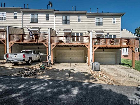 Beautifully maintained 2-car garage townhome in golf course community of Sunset Ridge w/3 swimming pools available (2 within walking distance). Each bedroom has private bath & walk-in closet, perfect for roommates. Open & spacious floor plan give this home a large feel. Stainless appliances, 9' ceilings, gas log fireplace, oversized deck, private wooded view & unfinished basement room off garage (could be finished or used as workshop). Convenient to I-540, shopping, restaurants, theater, parks & lakes!