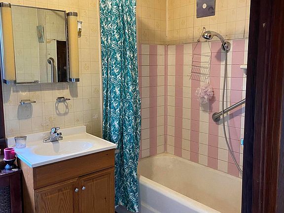 Starter or rental property. 2nd unit downstairs isn't habitable but can be redone. 3BRs, 1BA plus attic space. Roof 2018. Security system, CB system. Sold ''as is''. Owner out of state so buyer must get occupancy permit. Put ''as is'' buyer responsible for occupancy permit in the contract. The property only goes about 2 feet past left side (no yard). Cash or conventional. All replacement windows