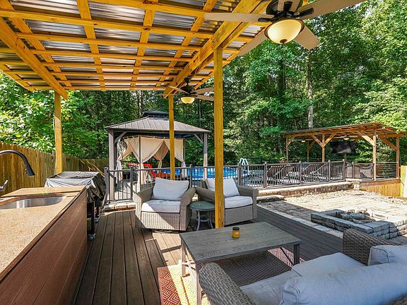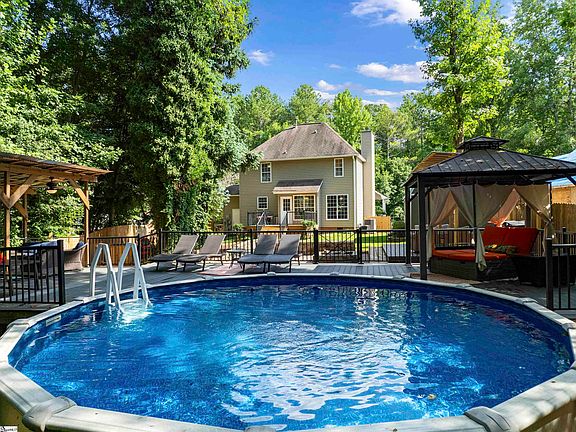 Welcome to 110 Woody Lane, a serene 3-bedroom, 2.5-bathroom cul-de-sac home nestled on a generous 0.79-acre plot in Easley, providing the perfect balance of privacy and outdoor luxury. Highlights include an outdoor kitchen, pool, trex decking, a covered cabana, stone firepit and much more. This property is truly an entertainer's dream with so many wonderful areas to relax, lounge, and cool down! As you step inside, you're greeted by a charming dining room on the right, featuring a large bay window that frames the lush wooded views. To your left, an inviting open living room bathed in natural light showcases wood floors, flowing seamlessly into a spacious breakfast area overlooking the stunning backyard. Around the corner is the open kitchen, which not only overlooks the backyard but also provides ample space for a bar-island. All appliances, including the washer, dryer, and refrigerator, are included, ensuring a move-in-ready experience. Outside, the magic continues with a large shed equipped with electricity, perfect for an art studio or office conversion. Envision yourself enjoying crisp fall evenings, gathered around a large stone fire pit on the paver patio, the perfect spot for sharing stories and making memories. Entertain effortlessly on the covered Trex deck, which features a fully-equipped outdoor kitchen with a sink and stove, where you can prepare meals while surrounded by friends and family. During the warm summer months, unwind on the expansive Trex deck encircling the sparkling pool. Here, a covered cabana and a comfortably seated area allow you to watch TV right from the pool, ensuring relaxation and entertainment are always at hand. The backdrop of dense woods enhances the sense of seclusion and creates a tranquil atmosphere, making every moment outdoors truly magical. Back inside, the upstairs primary bedroom is a spacious retreat with room for a seating or library area, a large bathroom with dual vanities, a linen closet, and a huge walk-in closet. Two additional spacious bedrooms share a large bathroom. The home is meticulously maintained with a new roof from 2018, all decking built within the last five years, and a new pool liner installed within the year. With wood floors throughout and a fully fenced backyard, this quiet neighborhood surrounded by woods provides a tranquil and luxurious living experience.