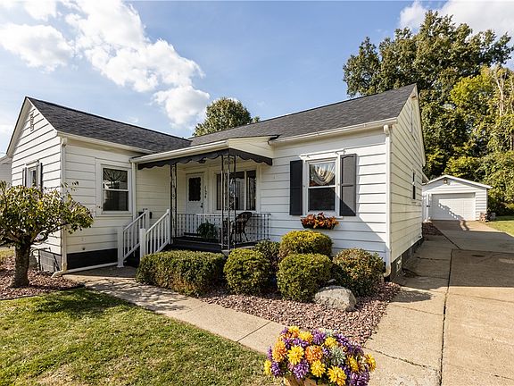 Welcome to this flawless 2-bedroom, 1-bath ranch home! Recently updated, it features brand new luxury vinyl plank (LVP) flooring in the kitchen and family room, complemented by a freshly painted interior. The kitchen shines with refinished cabinets, Corian countertops, and brand-new stainless steel refrigerator and dishwasher. Enjoy modern light fixtures, ceiling fans, and cozy evenings by the wood burning fireplace or hosting guests at your wet-bar. The large, waterproofed basement offers endless potential, while the 1.5-car detached garage provides extra storage. Step outside to a serene brick patio, overlooking a massive concrete swimming pool with a deep end. The fully fenced backyard includes a convenient changing room near the pump house, perfect for pool days. With a new roof and a welcoming front porch, this home is move-in ready!