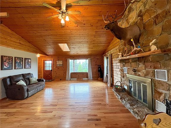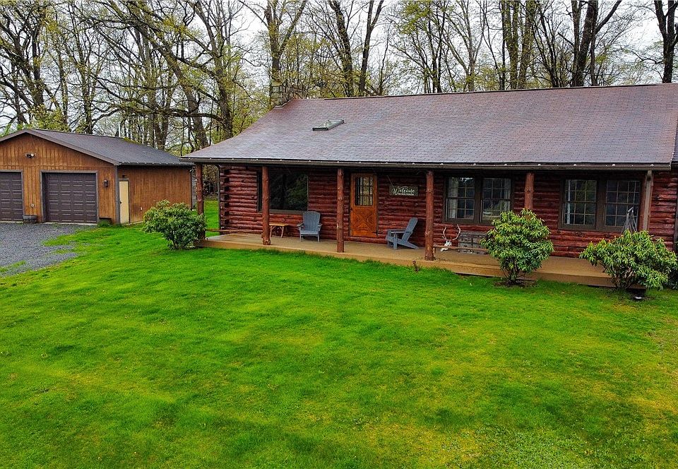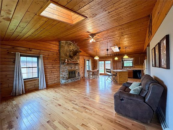 Check out this Beautiful ranch Log home with an open concept and tons of natural light. The main floor features a master suite, 2 additional bedrooms, cathedral ceiling, newer hard wood floors and a stone fireplace. The lower level has a a bedroom, or a bonus area, a family room and storage or space to finish as you like. Huge yard with a covered front porch and back deck. Heated over-sized garage for 2 cars and additional work areas.