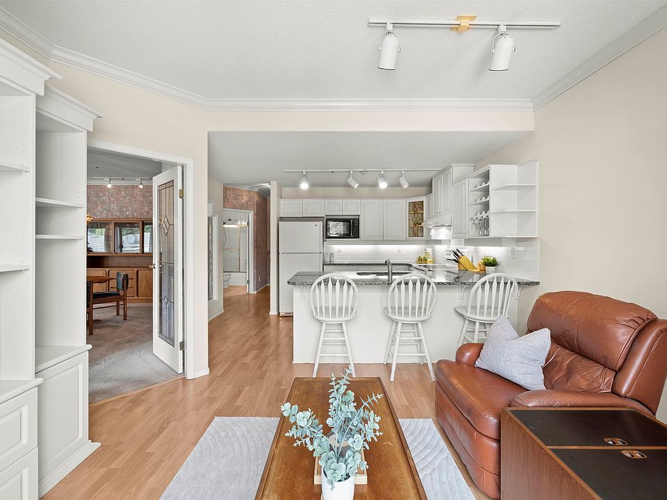Royal Oaks Sub-Penthouse Corner Unit - This is the one! Spacious 1,345 sq.ft. home in the heart of Tsawwassen featuring extra windows from multiple exposures that fill the space with natural light. Thoughtfully maintained, this 2 bed, 2 bath layout offers an oversized living/dining room with gas fireplace, a bright white open-concept kitchen with adjoining TV nook or casual dining area, and a large, functional floorplan perfect for entertaining. The primary suite boasts a walk-in closet and Spc ensuite. Bonus: dedicated side-by-side laundry room with overhead storage. Enjoy a large patio, secure parking, storage, and amenities. Unbeatable walkable location steps to shops, groceries, cafes, and transit.