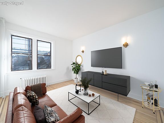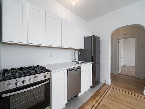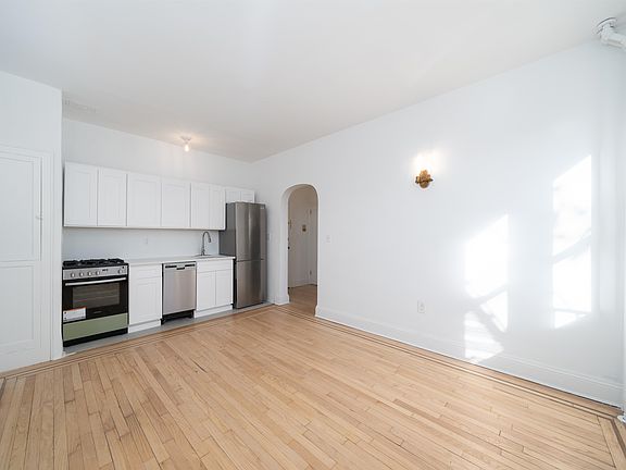 Lots of natural light in East facing 1 bed, 1 bath unit located across the street from NYC transportation. Brand new Kitchen with Stainless Steel Appliances overlooks the open concept living room/ dining area. Arch Opening in Foyer leads to hallway and a large bedroom. Hardwood floors throughout with a dark border in living room. Heat & hot water are included in the maintenance. Building also has a laundry room that is coin or app operated. Close to schools, shopping, NYC transportation (NJ transit bus 154 & 88 are at corner), major highways & James Braddock Park.