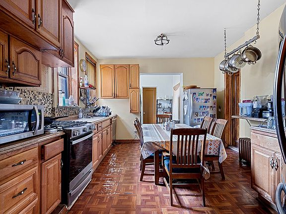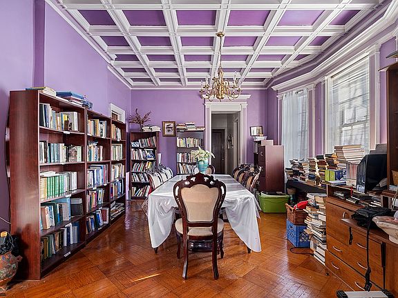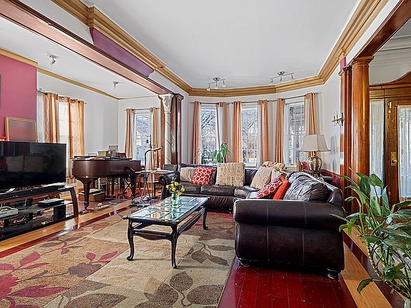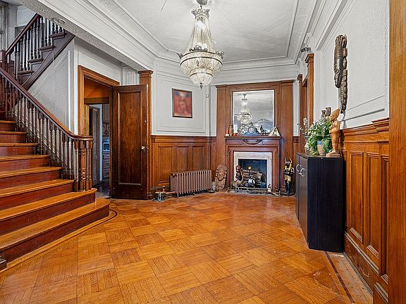 Built 36' wide and situated on a landmark block, this home is rock solid and offers intact, beautiful pre-war architecture. Upon entering, you are greeted by a massive foyer with an original decorative fireplace, a preserved original sitting room complete with a pier mirror and bay windows, 10.5' ft soaring ceilings, original oak floors preserved original wood details, a grand L-shaped staircase with a bench and the original intact stained glass, and a massive 23' ft living room with bay windows and columns. Just off the living room is a large formal dining room. To complete this floor, there is a large eat-in kitchen, a laundry room, a powder room, a full bath, and three large bedrooms in the rear.