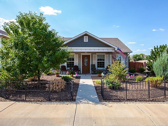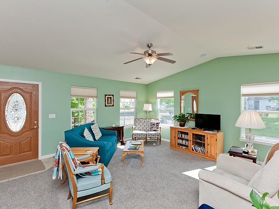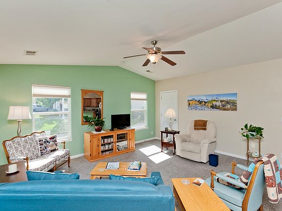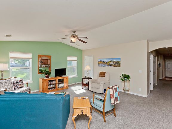 Light, bright, airy, and tidy 3BR, 2BA home on corner lot will charm you from the moment you drive up to the covered front porch with brick pillars, perfect for cooling off on summer evenings. The center front door opens into a large open-concept living area with vaulted ceilings and includes great room, large kitchen with beautiful maple cupboards with brushed nickel pulls, and spacious dining area. Bedrooms to the back of the house are all generous in size. Central air with thermal blinds that help with cooling costs. No maintenance yard with two sitting areas. This home is immaculate and is move in ready.