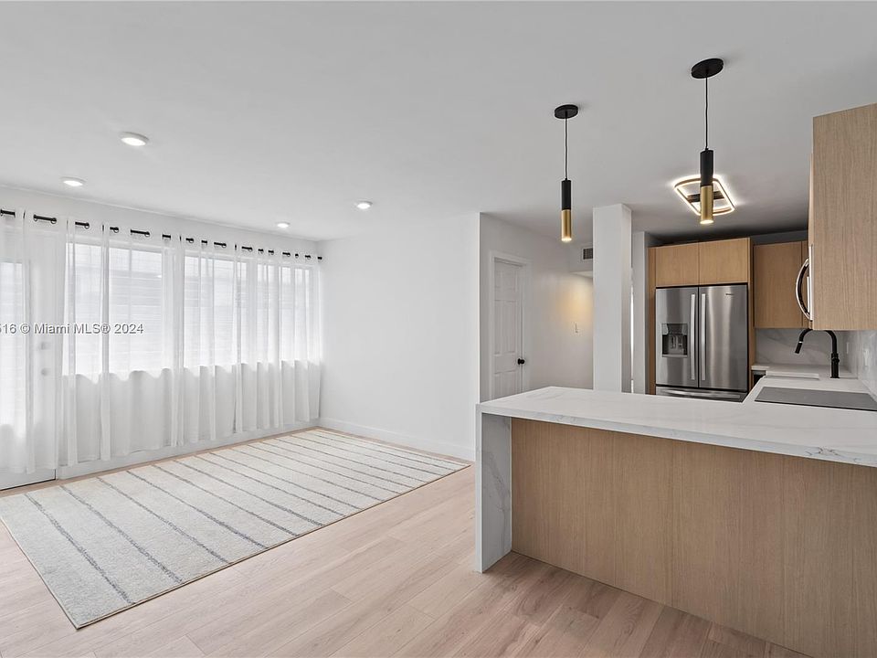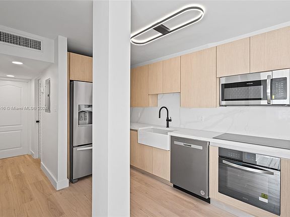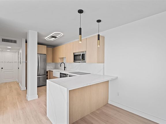 Newly renovated, this corner penthouse-level residence features a modern design with a 1-bedroom layout plus a den. Located across from the Bay, Flamingo Park, The Mondrian, & top dining experiences. No expense spared in the meticulous renovation, where every element was thoughtfully curated. The sleek, modern kitchen features state-of-the-art appliances & chic finishes tailored for discerning taste. Expansive wrap-around balcony & an additional balcony accessible from BR. Owner installed tankless water heater & in-unit washer/dryer, ensuring utmost convenience & luxury. Offers pool, gated/covered parking & communal storage space. Immerse yourself in the vibrant ambiance of the neighborhood & embrace the coastal lifestyle, with the beach just a stroll away.