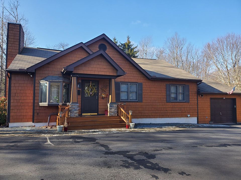 You want Beautiful Curb Appeal? This beautiful 3 bedroom 2 bathroom ranch home greets you from the road. Freshly painted cedar shake siding, paved circular driveway, 1 car garage, sitting on a corner semi fenced in lot within walking distance to the Township park. Inside is just as beautiful! Upon entering remove your shoes in mudroom and step onto the gorgeous wood laminate flooring throughout. Enjoy the cozy brick fireplace w/gas insert in the living room , also a separate family room for entertaining and your own Master bedroom suite. Be sure to check out the rear deck with awning! Be the next owner to show off your Pride in ownership! Very low dues community within driving distance to all Pocono Attractions and easy on/off highway access!