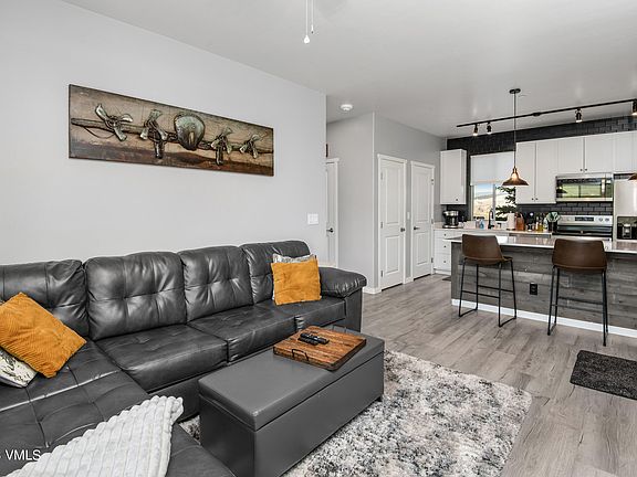 You have to see this beautifully finished 2 bedroom/2 bathroom condo to fully appreciate the attention to detail and excellent design style. The upgraded tile, barn wood accents, and light fixtures set this condo apart from other Mountain Gateway condos. Located on the ground level for easy access with a walkout south facing patio overlooking BLM land and mountains to the south. The open living area and kitchen offer high ceilings and a very comfortable flow. Large windows bring in lots of natural light and a very efficient floor plan makes the condo feel much larger than you would expect for the square footage. Quartz counters, stainless Whirlpool appliances, LVT flooring, electric radiant heaters with separate thermostats in each room, and a large storage closet outside the condo combine elegant finishes with functional features. The storage closet (5' x 6') works great for bikes, skis, camping, equipment, snow tires, etc. This is arguably the quietest location in the complex due to being on the perimeter and away from the entrance.