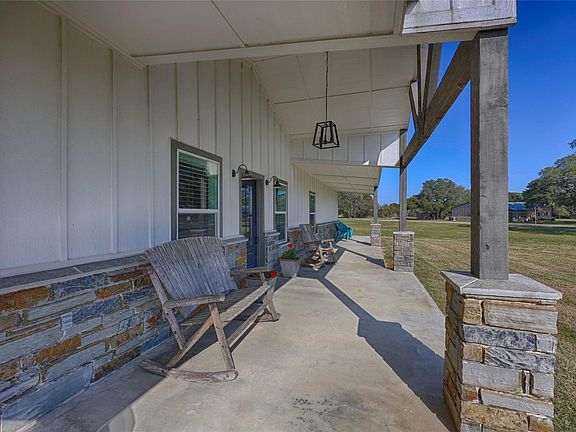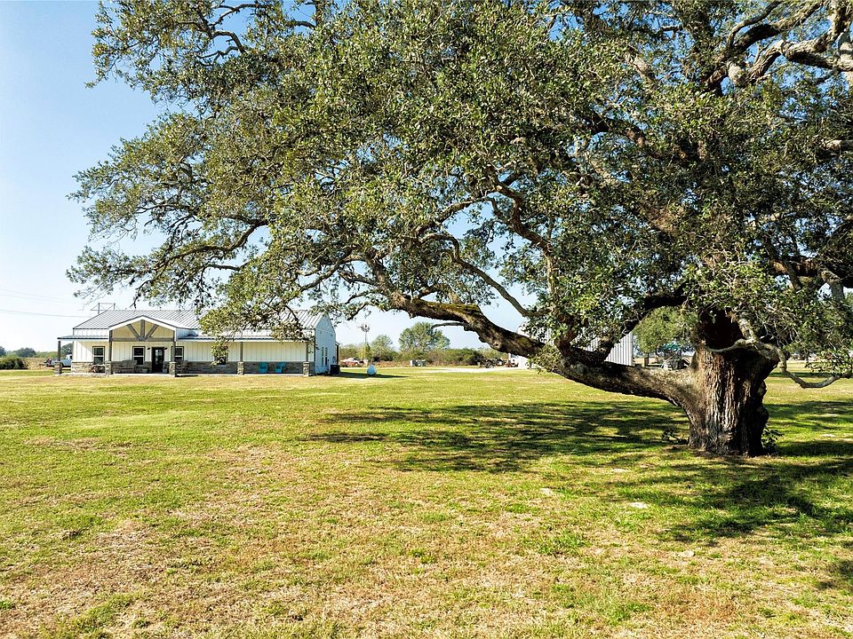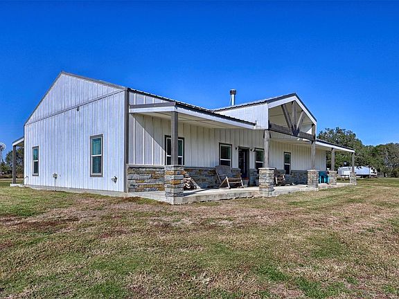 Nestled on 24.48 acres this custom-built (2022) 2,508 SF barndominium blends rustic charm with modern luxury. The home's exterior is highlighted by large front and back porches, sprawling century-old live oak trees and private pond for your outdoor enjoyment. Spacious interior includes 3 bedrooms, 2 1/2 baths with natural concrete floors throughout. The living room with vaulted ceilings, exposed wood beams, crown molding & ceiling fans, gives this open floor plan a modern farmhouse look. The gourmet kitchen is complete with an oversized center island with leather quartz surface, granite countertops, premium Cosmo & GE appliances and a wine fridge. The walk-in butler's pantry sits nearby along with a x-large utility room with lots of storage! The primary suite is extra large, w/huge walk-in closet, spa-like bath featuring double vanities, separate shower and classic claw-foot soaking tub. Too many features to mention them all, so schedule your showing now to see it all for yourself!