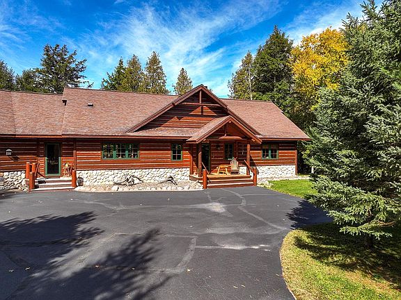 Opportunity to own this custom built home. Quality through and through this home exudes Northwoods charm with custom hand made shades and electrical covers. Great Room with Stone fireplace, cathedral timber ceilings and views from the wall to wall windows overlooking the lake. Main floor primary suite with attached bath, tile shower, double sinks and 2 walk-in closets. Main level laundry, 2 car attached garage and large mudroom. Lower level has gas fireplace in living room, 3 bedrooms, full bath, wet bar and office with cork flooring. Walkout is level to the water. Large lakeside deck with beautiful gazebo. Large detached garage with heated workshop. Large wooded 7.8 acre lot provides privacy on all sides. Crystal clear 872-acre Long Lake with a channel leading to Big Sand Lake. Winter wonderland with unlimited snowmobile trails options close to the Wisconsin-Michigan border. Association with access to Big Sand lake, clubhouse, basketball/tennis court and play area.
