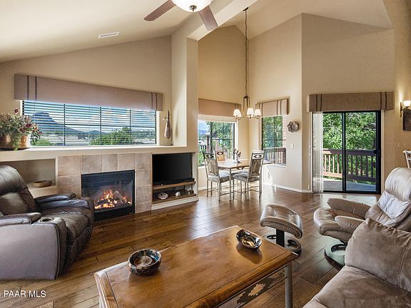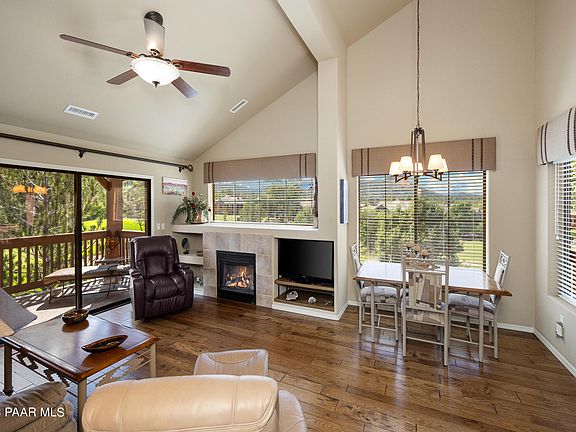 This upper-level condo offers breathtaking views of the Capital Canyon Golf Course, with a commanding vantage point overlooking a serene pond and the picturesque 11th green. Situated within the coveted gated community of the Villages at Hassayampa Golf Condo, this residence is a haven of luxury. Boasting 3 bedrooms, a loft, 2 baths, and a 1-car garage, this condo is nestled in an idyllic setting surrounded by the beauty of Ponderosa pine trees. Upon entering, the soaring vaulted ceilings create an immediate sense of space and airiness. The open layout of the living area is impeccably designed, drawing your gaze from the foreground's lush golf course green to the majestic backdrop of the iconic Thumb Butte. The interior design strikes a perfect balance between modern sophistication