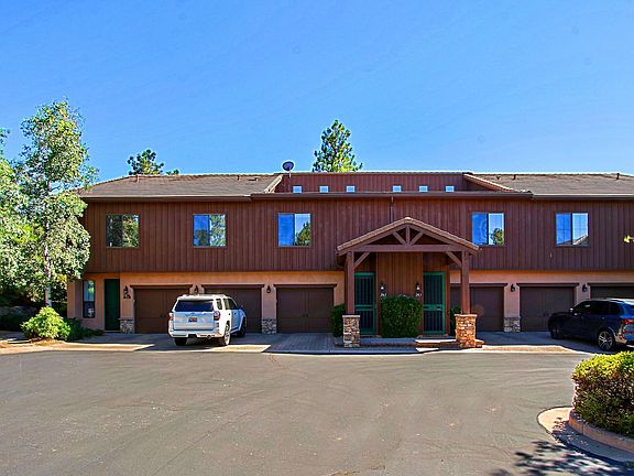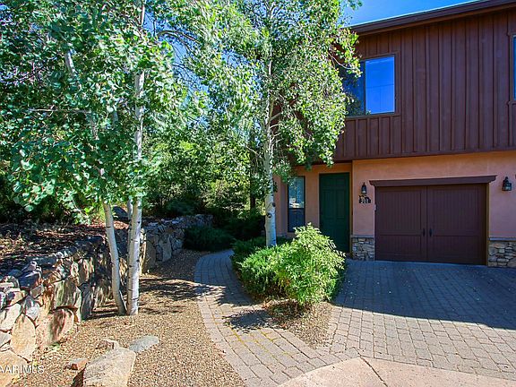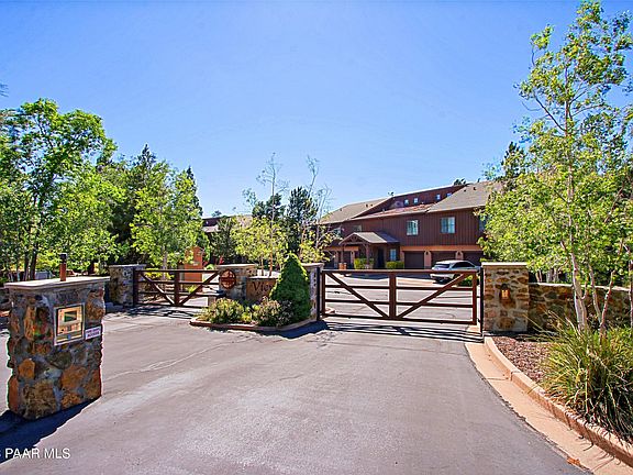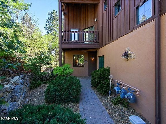 THE VIEWS AT HASSAYAMPA - Private, wooded for privacy, golf course, first floor condominium in beautiful Prescott. Two bedrooms, 2.5 baths, den, one car garage with additional surface parking. Paved entrance with rock formation wall. Flagstone paved back private patio also with rock knee wall. Travertine and carpet flooring, knotty pine cabinetry with accompanied tongue and grove beamed ceilings. Lots of windows making this lovely home light and bright. Kitchen has breakfast bar, SS appliances with electric two oven range. Granite counters. Dining area off kitchen - entire area open! Three-way fireplace. Niche pine cabinetry with glass top doors. Spacious primary bedroom and bath with walk-in shower and organized closet.