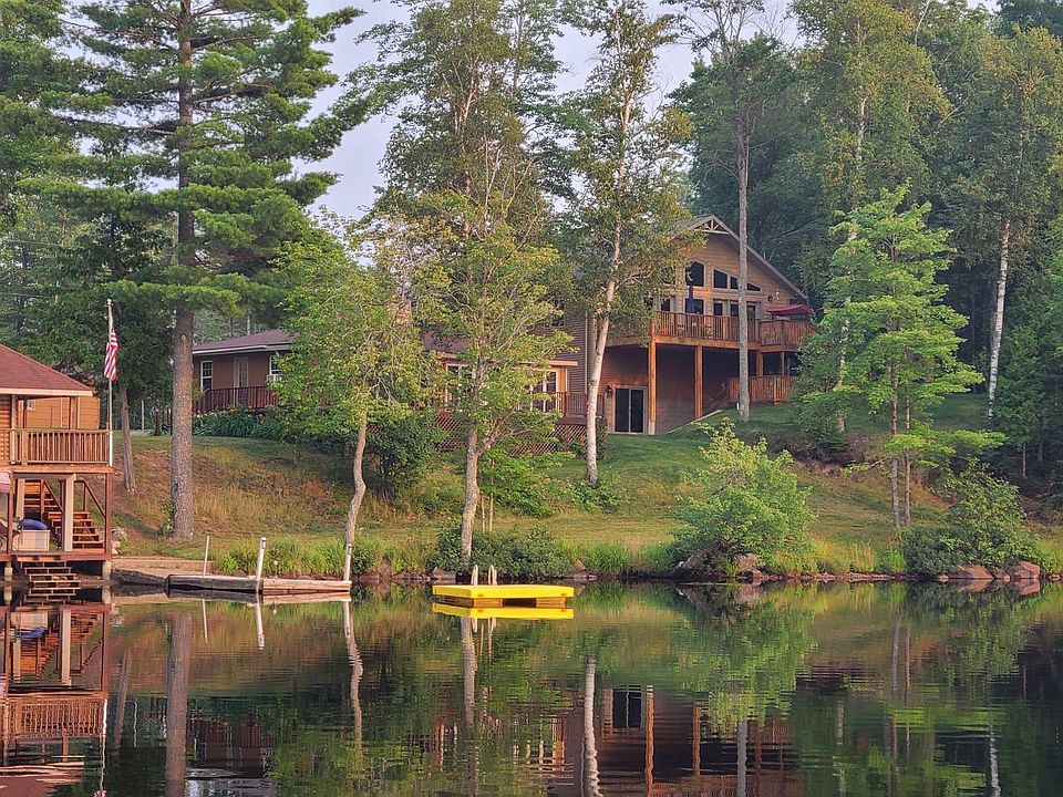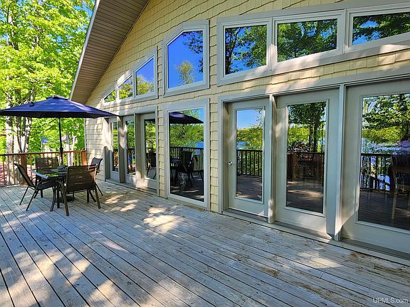 Welcome to 1100 E Fish Lake Road in Champion, a remarkable lakeside retreat offering 2.25 acres of serene beauty with 287 feet of pristine lakefront. This unique property encompasses three distinct buildings, two garages, and lush landscaping adorned with Apple, Plum, and Cherry trees. The main home, built in 2016 by GE Builders, features 2 bedrooms and 3 bathrooms with ceramic tiling. The custom kitchen boasts Alder cabinets, quartz countertops, Kitchen Aid appliances including a vented gas stove, and a walk-in pantry. The living room and kitchen have vaulted ceilings, hardwood flooring, and floor-to-ceiling windows showcasing breathtaking sunset views over Fish Lake. The primary suite includes a spacious walk-in closet and a luxurious walk-in tiled shower with a sliding glass door. Additional features of the main house include in-floor heating, central air, new gutters, a 25-foot deck, and a garage with 12-foot ceilings. The charming guest cottage offers 2 bedrooms, 1 bathroom, a sun porch with new windows, a Knotty Pine kitchen, a cozy wood-burning fireplace, and a bright living room with plenty of windows to enjoy the natural surroundings. The bunkhouse consists of a single large room equipped with log bunk beds, a deck offering scenic views, and a lower level featuring a large changing room and a relaxing sauna with a shower. A 22-kw Generac generator and heat connects to all three buildings, ensuring comfort and convenience. Fish Lake, with a depth of around 20 feet, is perfect for fishing, with plentiful Walleye, Northern Pike, and Crappie. The property is conveniently located less than a mile from the snowmobiling/ORV #5 trail, US-41 and approximately 35 minutes from Marquette. This idyllic sanctuary is perfect for those seeking tranquility and connection with nature. Whether you are looking for a full-time residence or a seasonal getaway, 1100 E Fish Lake Road provides the perfect blend of modern amenities and rustic charm. Experience the beauty of lakeside living with the convenience of multiple living spaces for family and guests. Don’t miss this rare opportunity to own a piece of paradise. Schedule a viewing today!