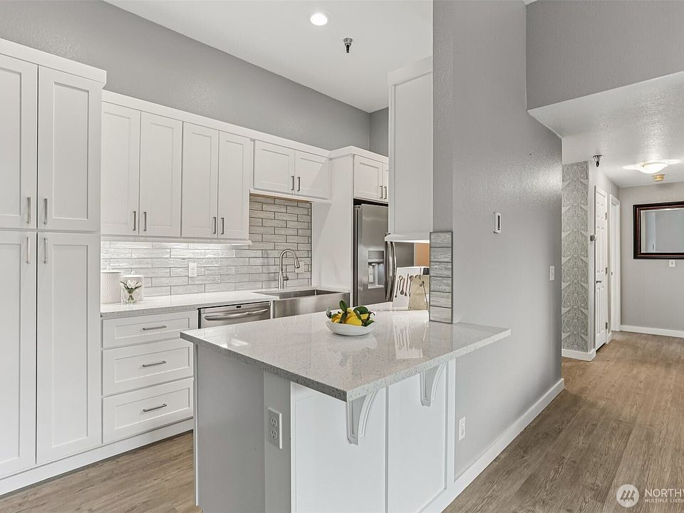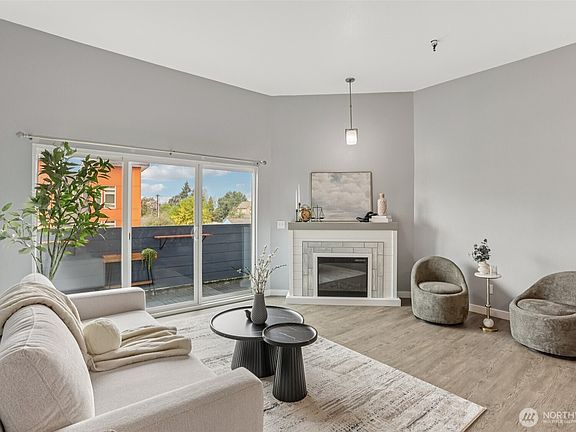 Experience modern living in this beautifully updated 2-bed, 1-bath condo with over 1,000 SQ FT of comfort and style. The sleek kitchen offers laminate flooring, quartz counters, tile backsplash, stainless steel appliances, and modern lighting. An open-concept layout connects the living, dining, and kitchen areas, centered around a cozy fireplace and breakfast bar. Spacious bedrooms & refreshed bath with quartz and tile complete the home. Enjoy a private deck with storage, in-unit washer/dryer, and elevator access. HOA covers water, sewer, and garbage.No assessments. Indoor pool, sauna, fitness center, meeting room, secure patio. No rental cap. Prime Renton Highlands location near Boeing, I-405 & Lake Washington. Nicest unit in the building!