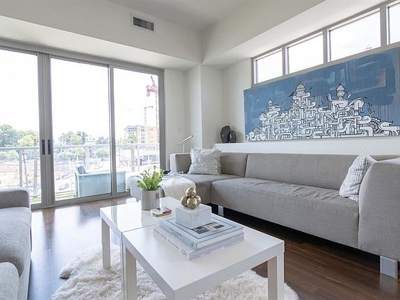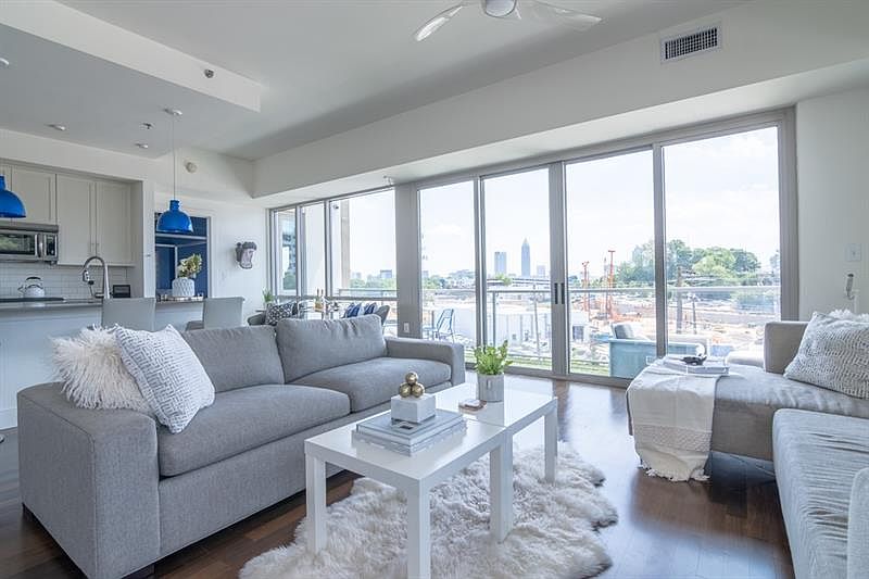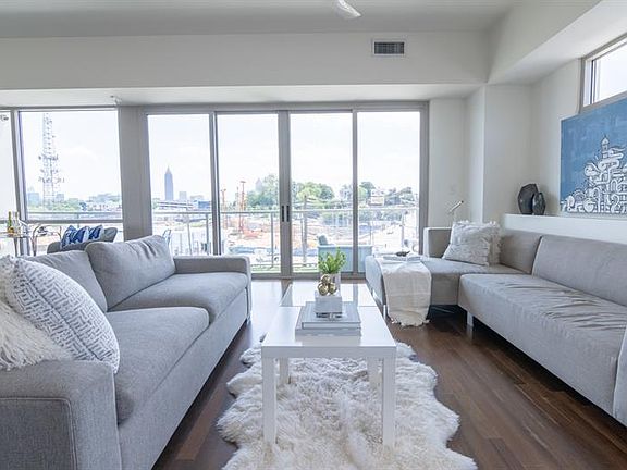 Stunning corner unit condo with spectacular 270 degree views of the Atlanta skyline, from sunrise to sunset. TRUE 2 bedroom & 2 bath at White Provision in the heart of West Midtown, steps from tons of shopping and dining. Many thoughtful additions, from retractable TV stand, to Shade Store window treatments, Rejuvenation lighting and imported wall coverings. Tons of storage added in hall and master water closet. JUMBO storage unit on 5th floor. Huge south facing patio stays warm on sunny winter days, covered in comfy turf. 2 deeded parking spots on same floor as unit.