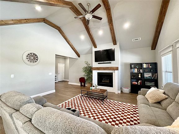 Attentional all Veterans! Assumable VA loan at 2021 rates! Gently lived in, almost new home! Located on the west side of Pea Ridge, less than 10 mins to I-49. This beautiful all brick home feels so much larger inside than it appears from outside. Large open concept living/kitchen area is great for entertaining & flows to covered patio w/fenced backyard. The spacious living room has large windows, wood beams, gas fireplace w/ wood mantel. Kitchen features a large island, granite counters, tile back splash, stainless-steel appliances & pantry. Huge primary bedroom suite is trimmed w/ crown molding & bathroom w/ dual sink vanity, 2 walk-in closets & large tile shower. With the split floor plan, the secondary bathroom & 3 bedrooms are on the opposite side of the house. Wood floors flow throughout the main living area w/ carpet in bedrooms & tile floors in wet areas. Energy efficient insulated garage doors & walls & Low E windows. Gutters on the exterior. POA includes neighborhood park w/ playground & basketball court.