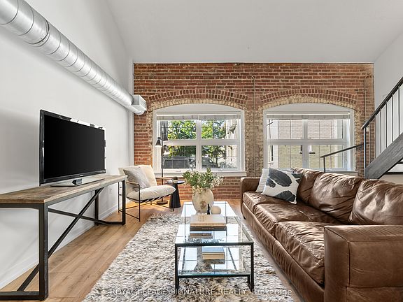 Architecturally iconic. Creatively inspiring. Unapologetically cool. Welcome to The Foundry Lofts an authentic two-storey hard loft that delivers nearly 1,200sq.ft. of industrial charmand modern design in one of Toronto's most captivating conversions. This 2 storey, west-facing loft is a rare gem, featuring 2 full bedrooms, 2 bathrooms, and 2 parking spots-a true luxury in the city. Soaring ceilings, exposed heritage brick, oversized warehouse-style windows, and upgraded vinyl flooring set the tone for a space that feels both expansive and intimate. The open-concept layout blends form and function with a sleek contemporary kitchen, perfect for quiet mornings or impromptu dinner parties. Every corner of this loft is thoughtfully designed with clean lines, modern finishes, and a timeless industrial edge. Live at the intersection of history and creativity. Originally a 19th-century train factory, the Foundry now houses one of the city's most unique communal spaces: a 16,000 sq.ft. glass-topped atrium perfect for remote work, casual hangs, or photo-worthy meetups. Residents also enjoy a gym, theatre, party and conference rooms, and abundant visitor parking. Outside your door: Geary Avenues indie breweries and recording studios, the design shops and cafes of The Junction, the Italian flair of Corso Italia, and expansive green space at Earlscourt Park. Fuel up at Balzac's, dine at Parallel or Famiglia Baldassarre, and hop on the TTC in minutes.Take advantage of this rare opportunity to own a curated piece of Toronto's industrial past, updated for modern, inspired living!