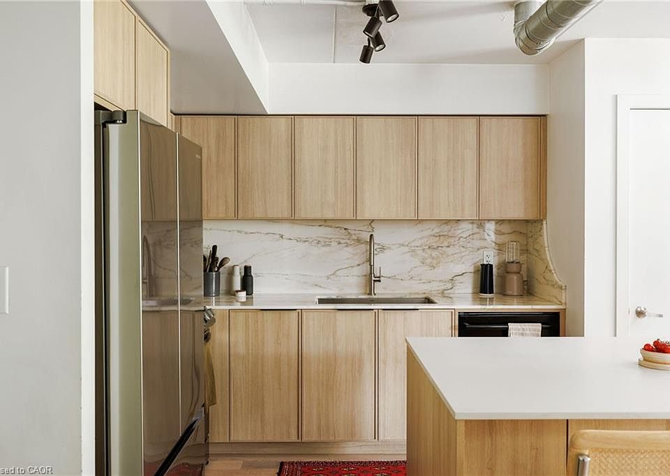 Step inside this incredible 2-storey loft in The Foundry Lofts. Once a train factory, now a one-of-a-kind industrial modern space. This unit offers 2 bedrooms, 2 bathrooms, in -suite laundry, and is packed with updates. New engineered hardwood floors, brand new appliances, and a completely reimagined kitchen featuring marble countertops and backsplash, custom cabinetry, and a stunning island with a Caesarstone quartz top. The open-concept layout is flooded with natural light from the huge windows that stretch across the space. The building has all the essentials: gym, party room, media room, visitor parking and a beautifully designed central atrium that offers a serene space to relax or entertain year-round. Perfectly located in Toronto's west end, close to TTC, Earlscourt Park, Balzac's Coffee, grocery stores, and more. RSA