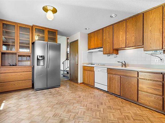 Great split-level in the Linn-mar district with 3 bedrooms and 1 bathroom with a retro blue bathtub and toilet. The kitchen boasts Corian countertops, ample storage space for appliances, and a built-in hutch, plus bay windows that let in plenty of natural light in both the kitchen and living room. All appliances stay, including the stainless-steel fridge, built-in stove top and range. The lower-level features retro carpeting, pegboard, a wet bar plus access to the deck that has composite decking and plants. The third lower level has a laundry area, additional storage/workspace, and the furnace includes a whole house humidifier. Huge garage with plenty of storage space. This house is the perfect combination of retro and modern amenities, providing a comfortable and inviting space to call home.