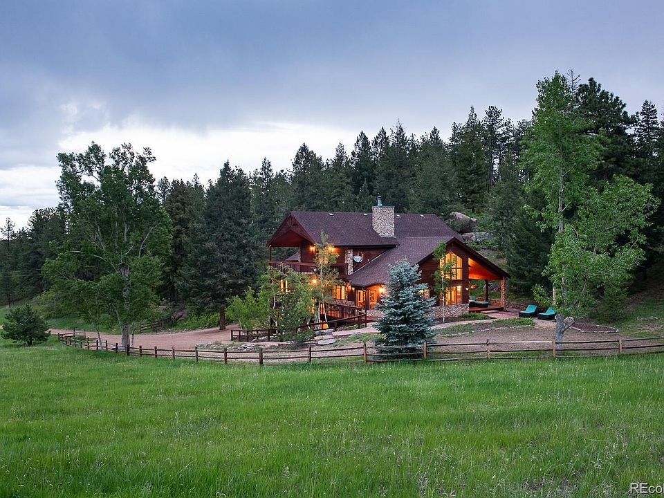 A stunning 70 acre Colorado mountain ranch including a 4 stall barn with miles of horseback riding trails on property. The location could not be better, the property is five minutes to the national forest where there is world class fishing, hiking, horseback riding, mountain biking while only 20 minutes to amenities and high end shopping, Whole Foods is 18 minutes away! As you enter through the private gated entrance, you'll be greeted by a stand of Aspens bursting with color, and a spring-fed pond. Whether you're a horse lover, outdoor enthusiast, or simply looking for a serene and secluded retreat, this ranch offers something for everyone. The property is home to abundant wildlife and offers miles of private equestrian and hiking trails, making it perfect for outdoor recreation. Tucked alongside the base of the meadow, the custom-built mountain home is warm, inviting, and comfortable, featuring a cozy wood-burning fireplace and vaulted ceilings in all four bedrooms and the great room. With windows offering incredible views of untamed nature. You'll be able to enjoy the beauty of the property from every corner of the house. The home is architecturally designed with three different porches, each with incredible views, making it perfect for indoor-outdoor living. Despite its seclusion and natural beauty, this ranch is conveniently located just 15 minutes from the charming Castle Pines Village and 20 minutes from the thriving boutique shops and restaurants of Historic Downtown Castle Rock. Plus, getting to the DIA airport is a breeze, as it's just a 45-minute drive via the uncrowded E-470. Excellent Starklink Internet, No HOA, private road, extensive forest mitigation offering significant tax savings. Small log workshop or storage building steps away from the barn. Riding arena next to the barn.