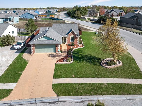 Wow!!! Take a Look at this beautiful Zero Entry formerly a Model Home in Derby KS that has No Specials~ Not only is the Outside a real eye catcher with its Lush Lawn on Sprinklers, Landscaping tastefully done where you can see the maintenance was definitely a fore thought * Backyard faces East * Underground Downspouts * Wood Privacy Fenced Backyard that has a sidewalk going from Front that wraps on around to the designer shaped Conrete Patio where a portion is covered to enjoy the outside in the shade, and the rest to be soaking in those rays * Storm Doors are Andersons, along with the Windows being energy efficient Low E Meritech, then notice the Window Well Covers = high end, let me also say the Inside is just as impressive : Lets take a walk Inside coming in the Stained glass Front Door * Luxury Designer Tiled Foyer * Vaulted Ceiling in the living area that has Ledges, built in Bookcase, direct vent high efficiency Gas Fireplace with Wood Mantel, Arched TV/Art Niche * Recessed Wafer Lights * Ceiling Fans thru out, having separate switches for lights/fans * Neutral Painted Walls thru-out entire home * Coat Closet * 32" Doorways * Hall Bathroom looks as its never been used * Kitchen boost with a Island that has Storage, Electric and Eating Bar - Tons of Cabinetry plus Cookie Sheet space - Lazy Susan - Built in Wine rack - Stove, Microwave, Dishwasher, Disposal stay - One touch Kitchen Blind, Built in Blinds in the Backdoor - small Dog/Cat door * Primary Bedroom has a Patio door with Blinds - Primary Bath having corner Soaker Tub with jets, Separate Shower, Water Closet, Luxury Designer Tile in the wet areas, sit down Vanity plus large amount of storage at the stand up Vanity, Walk-in Closet with Wood organizers that leads directly to the Laundry room * where you can come in from the Garage, Primary Closet, or the Front Foyer to that Mud/Laundry area that has a hanging bar with a Cabinet, built-in Wall organizer, and the Luxury Designer Tile. : How about we head downstairs to the large open Family room * Full Bathroom with the Luxury Designer Tile * Two big Bedrooms having the escape windows, really large Walk-in Closets both with Wood organizers, Ceiling Fans that are on a separate switch from the lights : nice amount of Storage in the Storage room that has two designated spaces plus the under stair Storage, then add in the pulldown ladder in the Garage for that attic Storage = you have a lot of Storage * Water Softener - Better Air Worlds First Probiotic Air & Surface Purifier - Manifold Plumbing - All Blinds stay - built-in Surround Sound speakers thru out~ "and" your just around the corner from High Park - Rock River Rapids Aquatic Park - Derby High School - and all the Shopping you'll need... think of it, YOU could you finish out the year being the Homeowner of this beauty~ All information Deemed to be Reliable but Not Guaranteed.