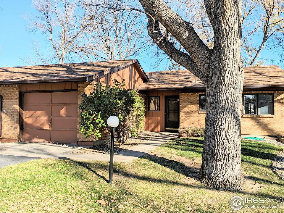 Make this 55+ brick single level home suit your tastes with updates. 2 bedroom 2 bath with an east facing sun room that leads to a patio. Cars minimal due to private community entrance and end of the road location in this small community. Beautiful mature landscape with a quarter-mile walking path that winds through large gorgeous trees. HOA handles snow removal, lawn care, exterior maintenance, social events and does not allow rentals or pets. Nearby shopping, restaurants, entertainment venues, coffee shops, recreational areas and trails. River's Edge Natural Area, Boyd Lake, and the City of Loveland's bicycle path system are all easily accessible.
