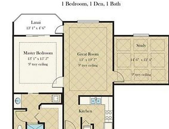 1 Walking Closet 1 Master Bedroom Kitchen Living room Den Room it is used as an extra room with a doble day bed and an office space.
