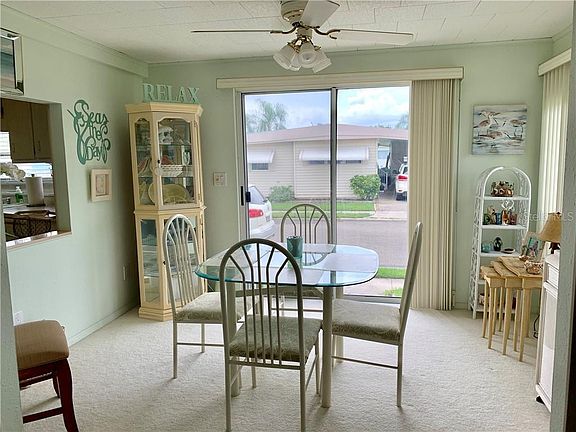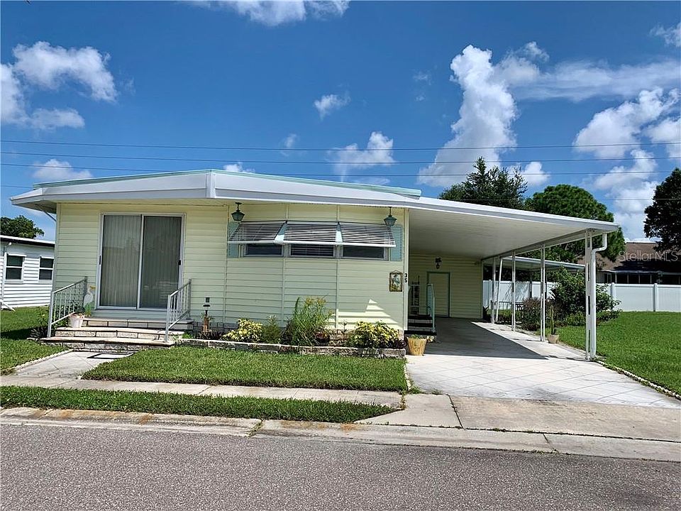 Come live the Florida lifestyle in this sought after gated community. This home is open concept with two bedrooms and two baths, inside laundry, dining, living, kitchen, bonus room off kitchen, private patio, covered parking for two cars and a storage shed. The owners own all the land, clubhouses, pools, gold course, streets etc. This home is a solid investment especially for the share value which keeps going up and up. Make Fairway Village your home today! The HOA fee is only $299.00 per month and includes most everything(you pay your electric). This home has recent updates, outdoor shower, new sliding glass doors, new front door, new A/C, new refrigerator and new washer and dryer. This home has a great location with a large side and back yard fully maintained by the HOA. Get your private tour today and make this your new home tomorrow.