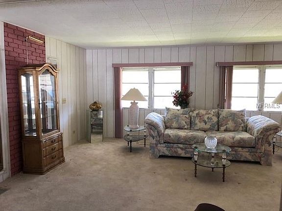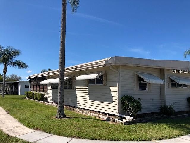 Corner Unit, Walk to Clubhouse, 2 Heated Pools, 2 Jacuzzi's, Par 3 Golf Course, 9 Hole, $10.00 a round. Approximately 7 miles to public beaches. Near restaurants and shopping centers. No Land Lease Community. H.O.A is only $276.a month, Includes, water, sewer, trash, basic cable, Internet at the clubhouse. Security Guard at gate from 6 PM till 6 AM. Shuffle board courts, and a fitness center and the clubhouse. central heat and air is 2011. Home has a roof over. two car carport, large shed with washer and dryer hook ups and a utility sink. Behind shed is a covered area for seating outside. Entering into the home, is a spacious dining room with built in china cabinet. Overlooks the large open living room, there is an extra 240 sq feet of a Florida room, that is not included in the heated sq feet. The bedrooms are on opposite sides of the home, Master Bedroom has a full bath with a shower and a vanity area, and commode. Huge walk in closet. Guest Bedroom has lots of storage area as well. AS closet space. Kitchen is fully equipped with all the appliances and is light and bright. Note the adorable crystal light in kitchen,