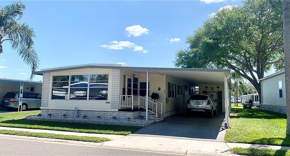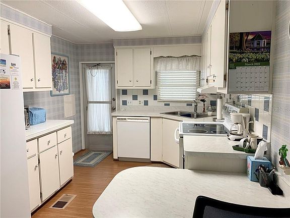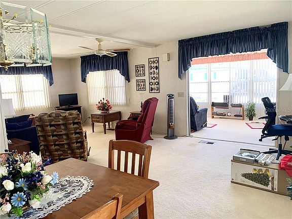 THIS HOME HAS A GREAT LOCATION WITH WALKING DISTANCE TO OFFICE AND CLUBHOUSE. A 2 BEDROOM, 2 BATH WITH A OPEN FLOOR PLAN FROM DINING TO LIVING ROOM. THE FRONT FLORIDA ROOM IS ON THE FRONT OF THE HOME AND HAS CENTAL HEAT AND A/C. NEW PLYWOOD FLOORS UNDER CARPET RECENTLY DONE IN 2020. NEW VAPOR BARRIER COMPLETED IN 2021. NEW FOOTER AROUND OUTSIDE FOR DECORATIVE BLOCKS, SO THEY WILL NOT FALL OVER. LIFETIME ROOF OVER (2005), A/C (2008) UPDATED APPLIANCES AND ICE MAKER IN REFIGERATOR. BEAUTIFUL LAMINATE WOOD FLOORS IN KITCHEN HALL AND BOTH BATHROOMS. EVERYTHING IS NEUTRAL IN COLOR, FUNISHED AND READY FOR NEW OWNER. NICE PEBBLETECH DRIVEWAY WITH WASHER AND DRYER IN THE OVERSIZED SHED. NOW ID THE TIME TO PURCHASE. THIS HOME WILL NOT LAST LONG ON THE MARKET. HURRY BEFORE IT GOES PENDING. THE 55+ COMMUNITY WILL SURELY WOW YOU. COME SEE!!! NO PETS ALLOWED IN THIS LOCATION.